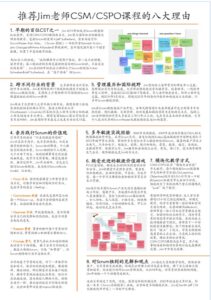 Jim可中英文授课,2020疫情发生,他积极调整教学模式,CSM及高阶课程采用“模块化分时段”单元教学,每个模块按Scrum联盟教学大纲和学习目标LOs(Learning Objectives)设计为3.5小时作为一个时段(session)和教学单元,共四个时段,彻底改变了传统的两个整天的填鸭式“push”线下教学。有脑科学研究资料揭示: 成人学习者持续3.5小时已经达到极限,有些中学分有Blue 和 Sliver Day也是基于相似的理论。新模式教学,给学习者留有一些时间和空间去消化吸收,反思回顾(Reflection), 讲师布置一些小作业让学员课后去练习,加固对知识点的学习, 同时学员有时间思考并提出问题,在线白板上把问题提前可视化出来,讲师在下一个时段提前准备解答;线下的体验互动式练习也“搬上”了线上,学员全程借助高质量的工具互动,线上培训效果直超线下;最受欢迎的敏捷价值游戏,沙盘演练,贴近企业的实战案例分析,在线上反而效果更佳,倍受学员点赞。